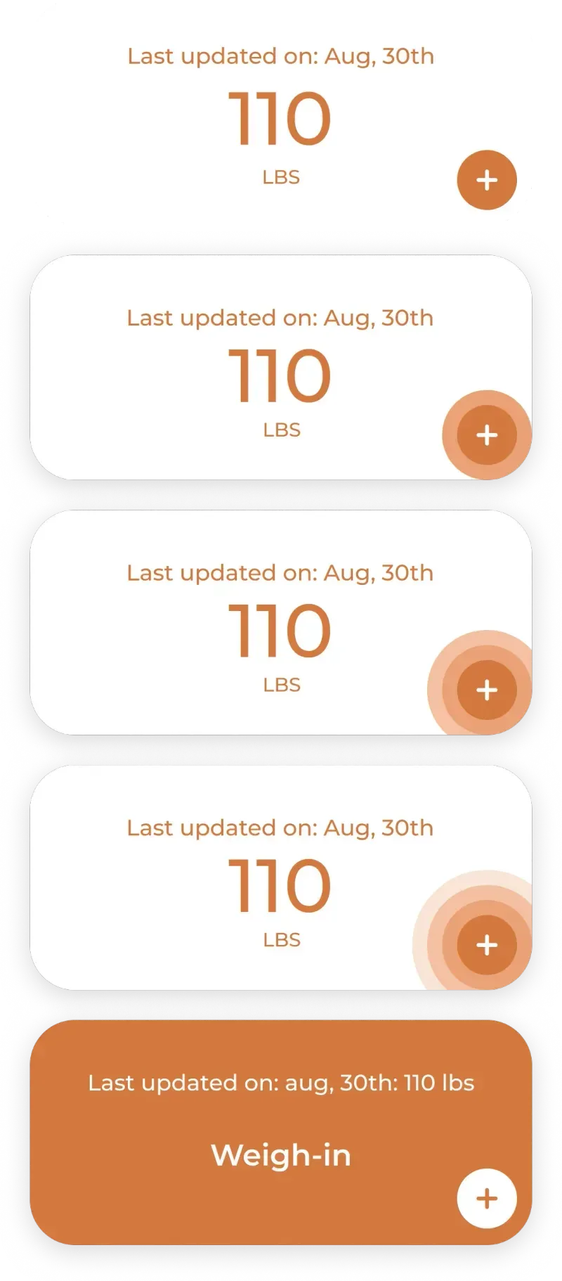 A Mega Input Field is designed for our main features in Healthi App. It is big enough to fill a significant part of a mobile screen\, and also allows different kinds of presentation, depending on preset parameters. For the example below, we have different ways the Weigh-in Mega Input Field behaves depending on the last time this particular user has tracked their weight