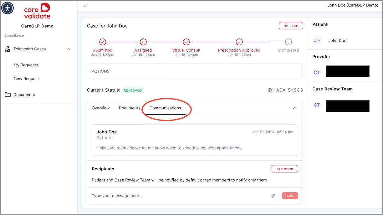 2. Once you are logged in, navigate to the communication tab to send any questions or concerns to your Provider. You will also be able to view messages from your provider or your Care Team.