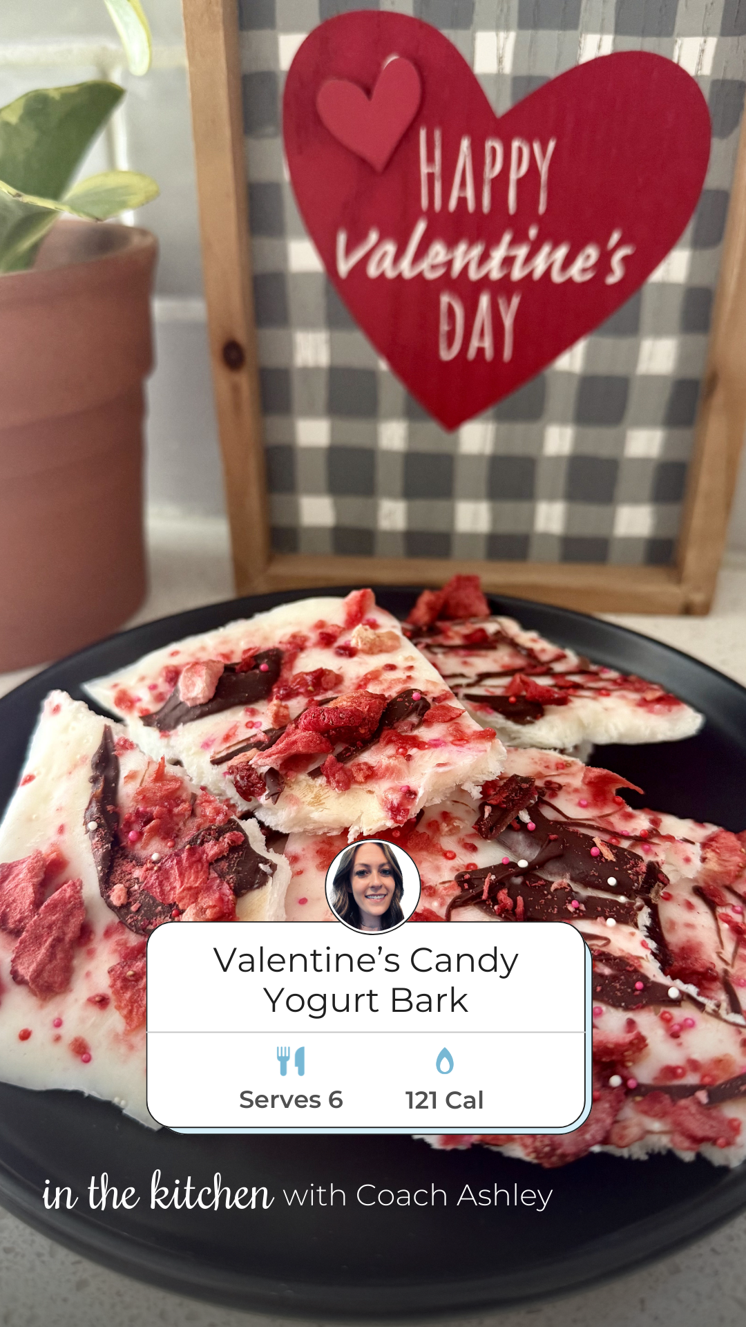 This bark looks like something straight from a Valentine candy box! Chocolate swirls, pink and red sprinkles, and dramatic cracks — but it’s light, portion-controlled, and surprisingly fresh & satisfying.